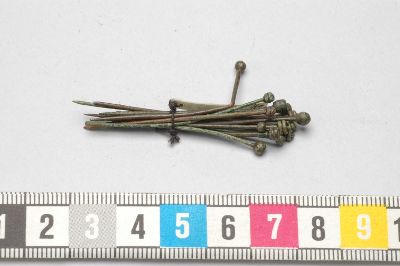 Najpierw - sama szpilka. Istnieje bardzo dużo znalezisk tego rodzaju artefaktów. Duża część z nich posiada dosyć złożone, często odlewane główki, co trochę utrudnia takie zamówienie. Na szczęście w źródłach sporo jest też szpilek z zawijanymi główkami. Obok i poniżej kilka przykładów tego rodzaju zabytków. Wszystkie wykonane są z stopów miedzi (mosiądz, brąz etc).